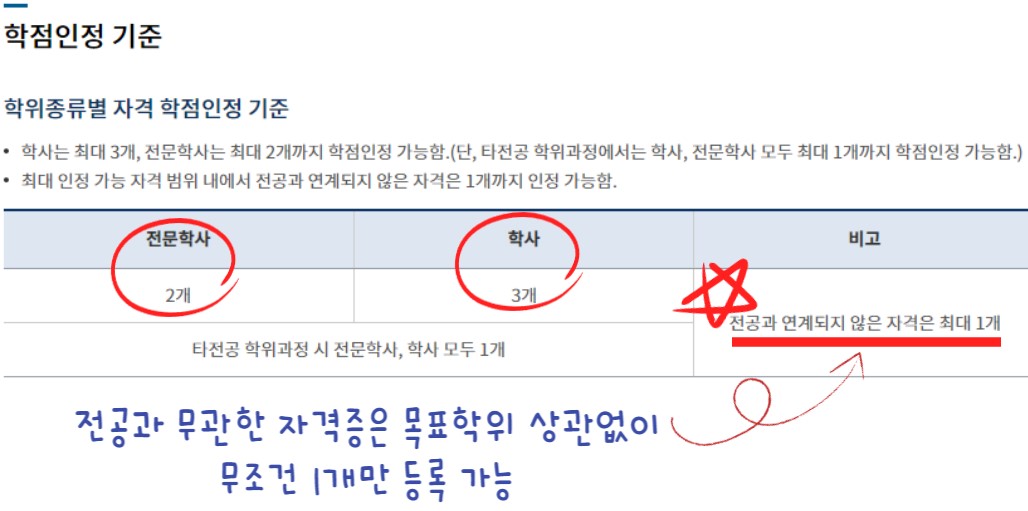 선택한 목표 학위에 따라서 자격증 등록 개수 제한이 존재하기 때문에 이 내용을 먼저 알아두는 것을 권장한다.