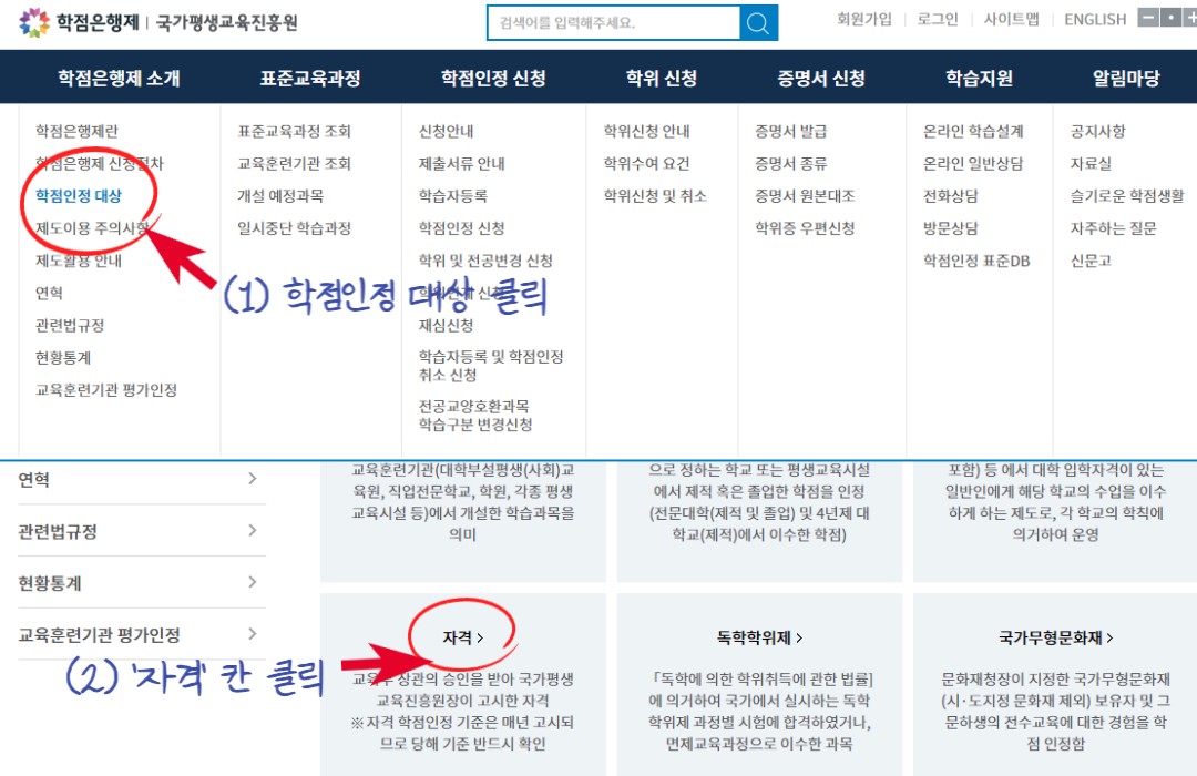 국가평생교육진흥원 학점은행제 홈페이지 접속, 학점은행제 소개 칸에서 '학점인정 대상' 클릭 '자격'칸 클릭