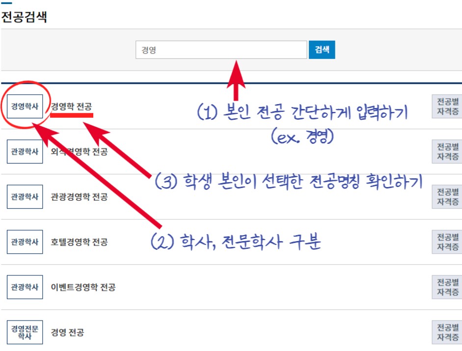 예를 들어서 학생이 '경영학 학사학위' 과정을 진행한다 하면 학사학위를 선택했기 때문에 자격증은 최대 3개까지 등록할 수 있으며 경영학 전공을 선택했기 때문에 자격증은 경영학 관련 자격증으로 얻어야 한다는 것이다.