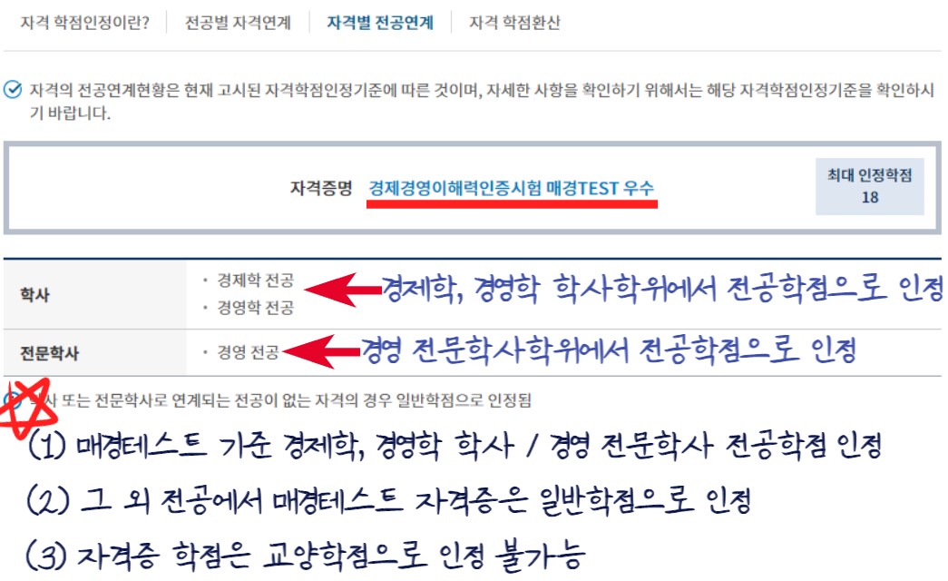 이를 통해 알 수 있는 건 매경테스트 우수등급 자격증은 학사학위 과정 중 경제학, 경영학 그리고 전문학사 과정 중 경영 전공에서 전공학점으로 인정해준다는 것을 의미한다.